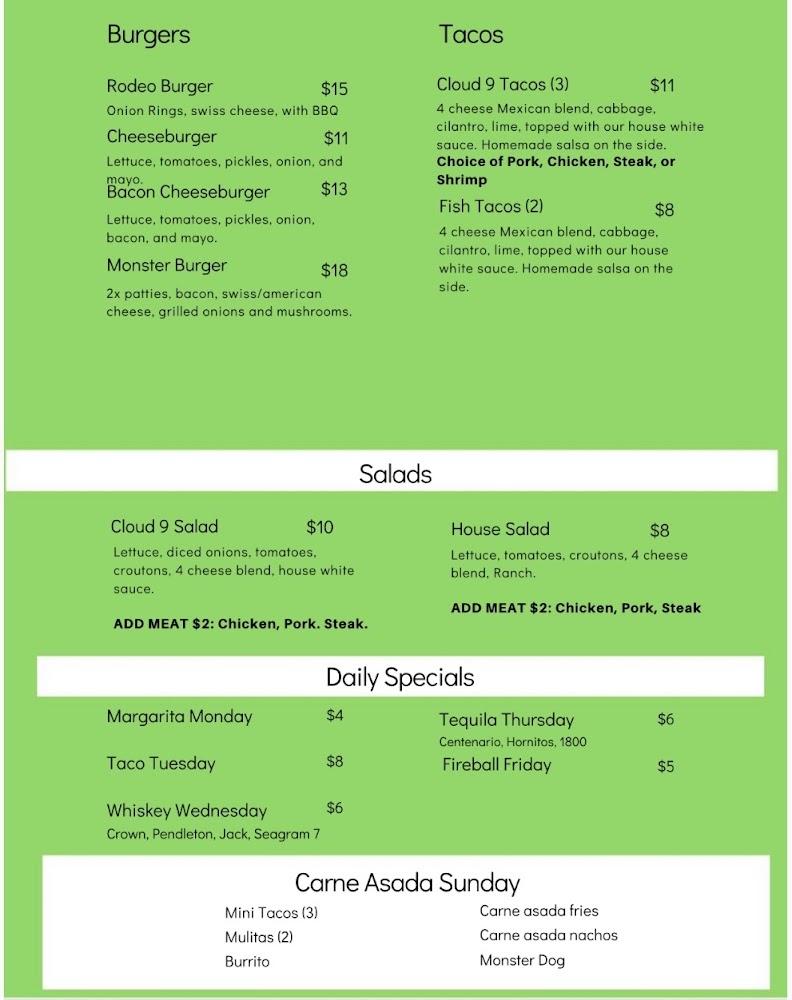 Cloud 9 Bar and Grill boasts a diverse menu that satisfies every palate. Signature burgers like the Rodeo Burger and the Monster Burger stand out, alongside lighter options like the Cloud 9 Salad. Their taco offerings range from traditional to innovative flavors, appealing to adventurous eaters.